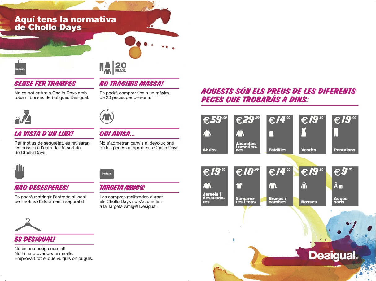 Els qui coneixeu la iniciativa de Desigual, Chollo Day, no us quedareu indiferents si us diem que seran amb aquesta pop-up store al Rec.03. Una oportunitat única de comprar la roba singular de Desigual a preus més que baixos, uns preus que no trobareu enlloc més. Roba d’altres temporades d’home, dona, nen i accessoris. El concepte de venda és totalment radical, com els preus! No us ho perdeu!